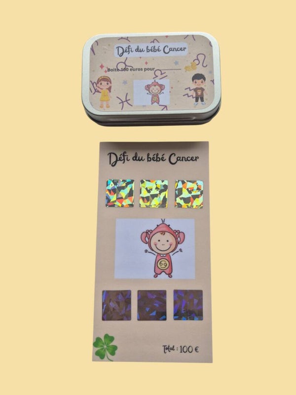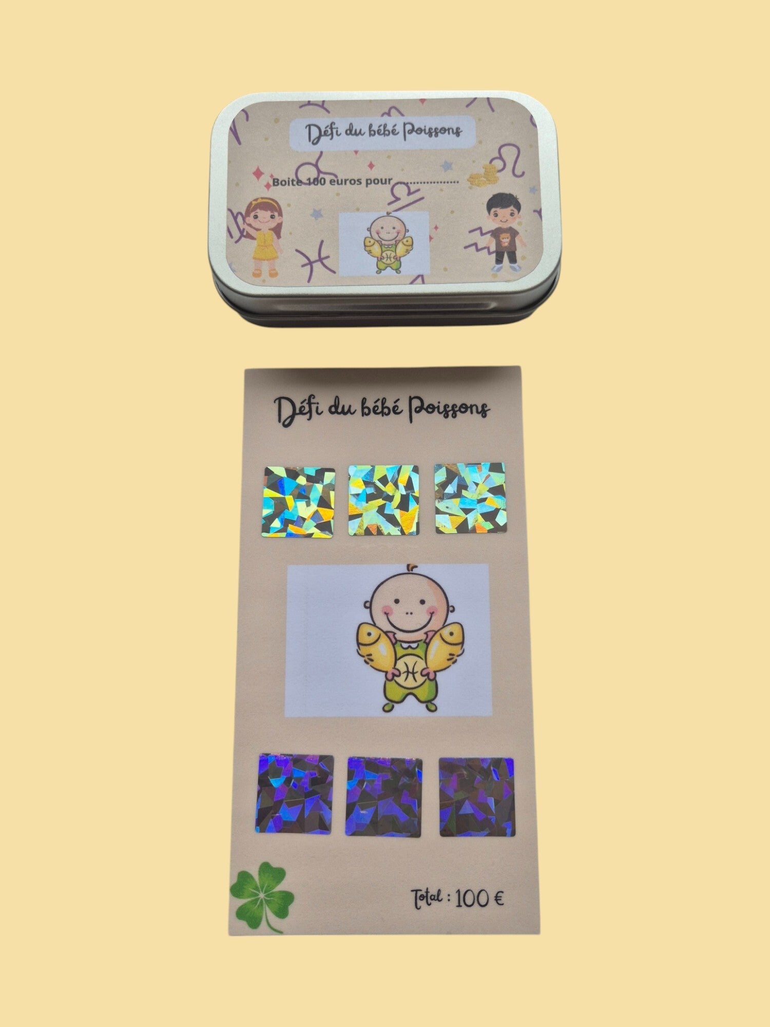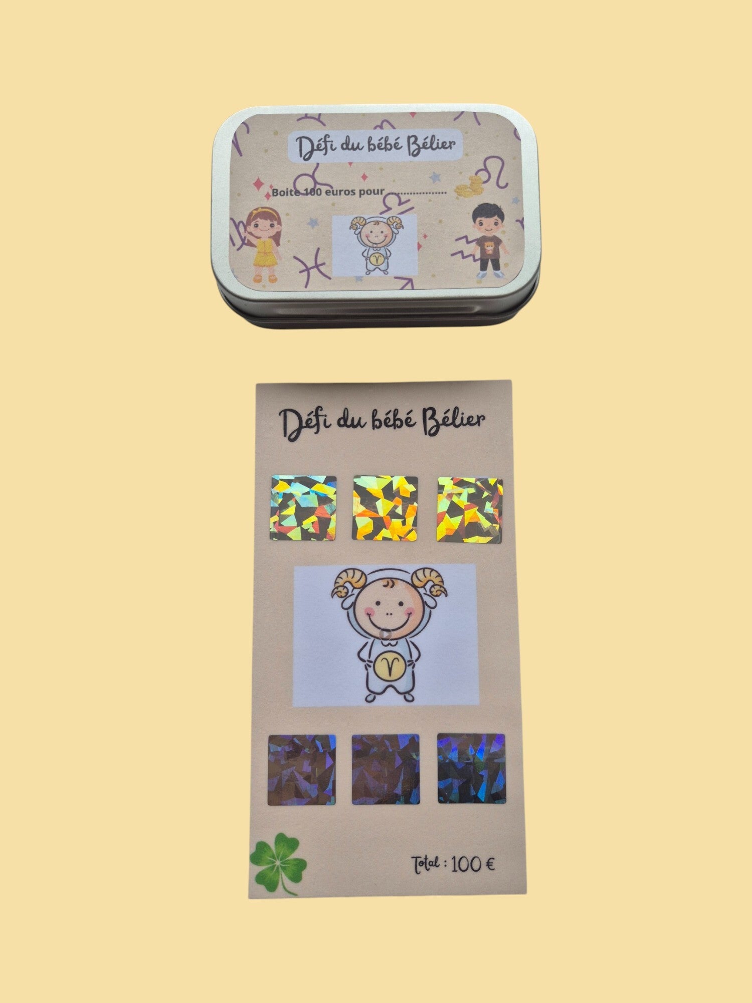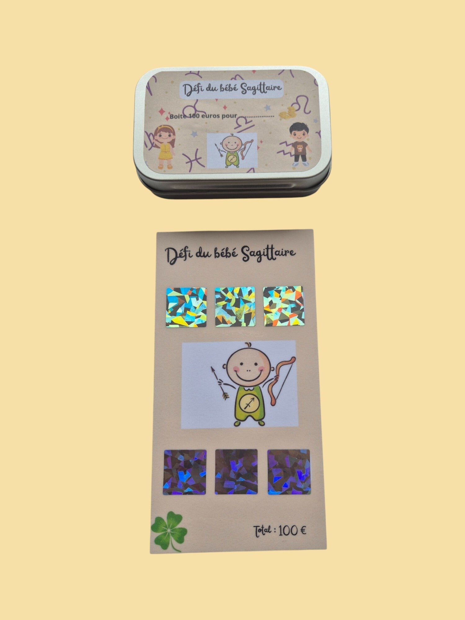 un tracker signe astrologique de votre enfant avec 6 cases surprises à gratter pour économiser 100 euros pour votre enfant ( à remettre sur un compte ou à garder)