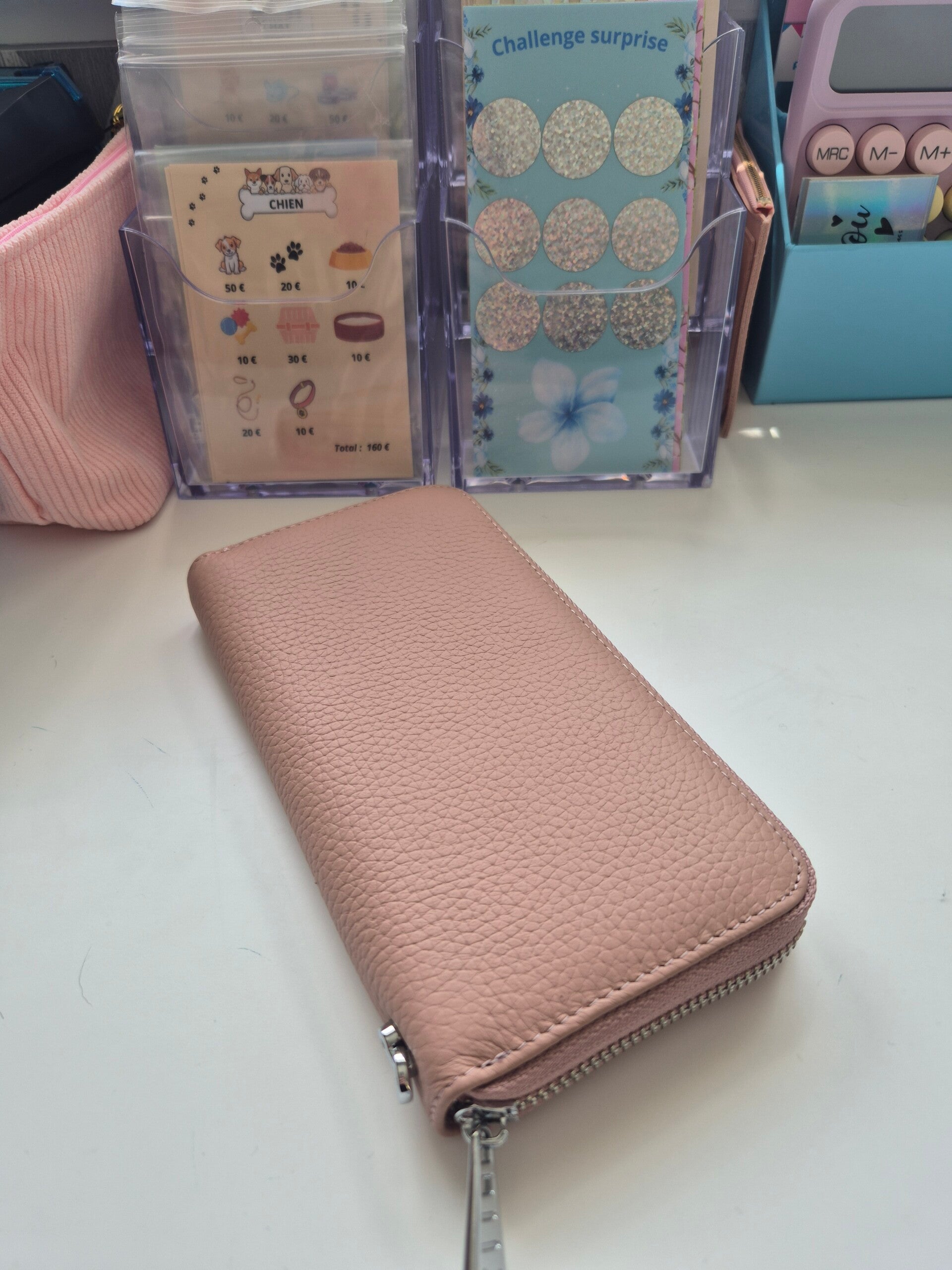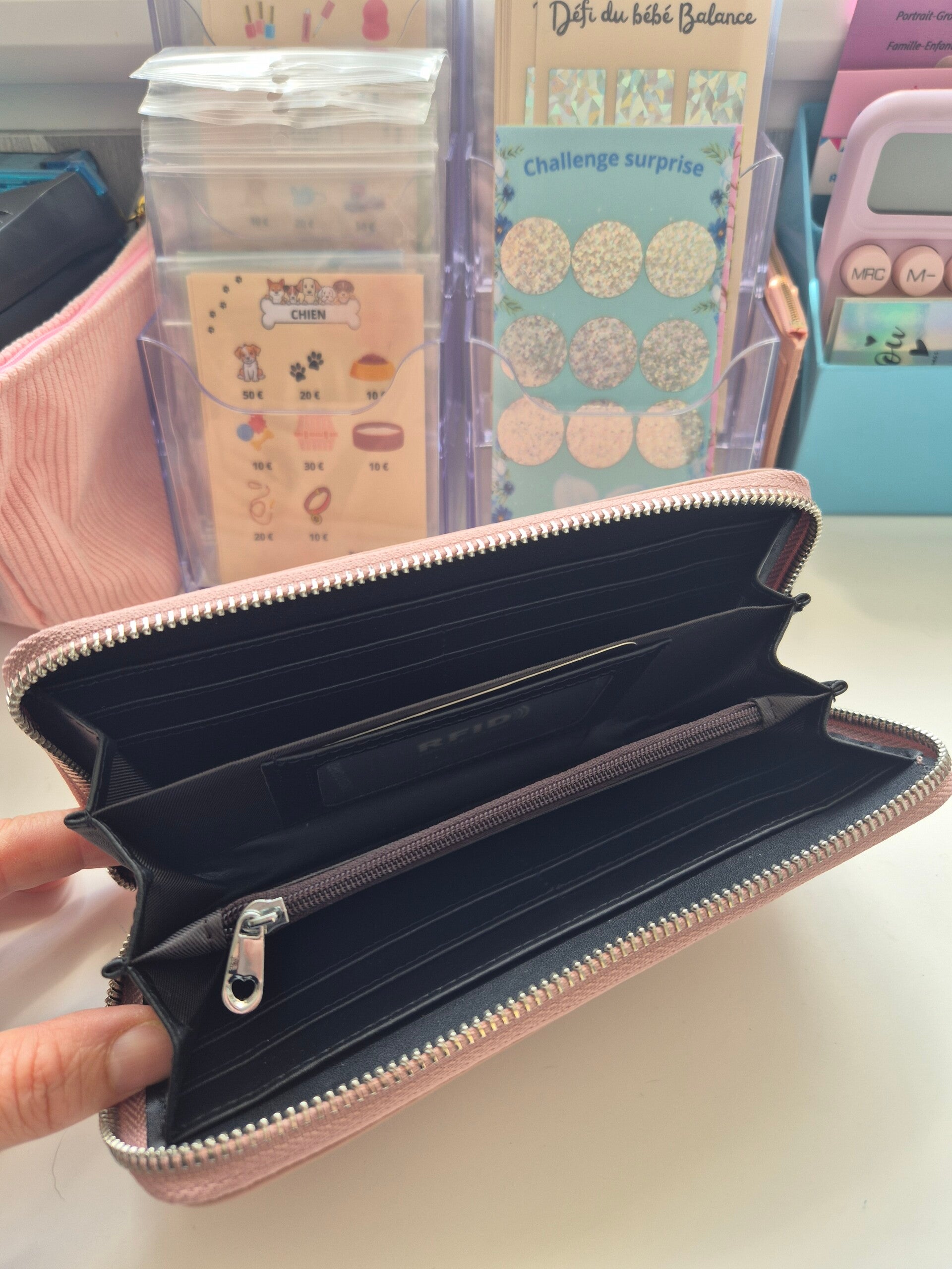 Portefeuille rose avec plusieurs compartiments pour carte de crédit