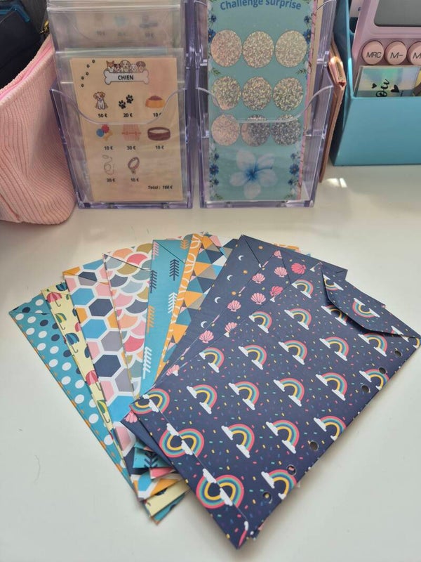 Au centre 12 enveloppes rigides multicolores pour ranger vos billets, notes, .....